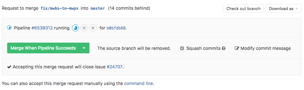 When you hit the "Merge When Pipeline Succeeds" button, the status of the merge request will be updated to represent the impending merge. If you cannot wait for the pipeline to succeed and want to merge immediately, this option is available in the dropdown menu on the right of the main button.